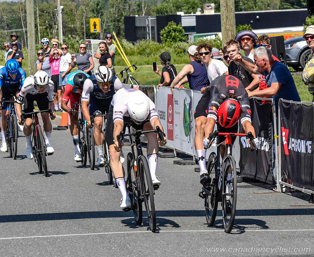 The Elite men's race saw multiple breakaways, but the high pace meant nothing could stick. A crash in the final lap thinned the field, but Cannondale Echelon p/b 4iiii appeared to have set up Philippe Jacob perfectly. The team's hopes were dashed when Olympian Mathias Guillemette (Tudor Pro Cycling), a track specialist who has moved to the road, came charging through in the final metres to win by a quarter of a wheel with a bike throw. Carl Truffer (Les Régis pb Groupe auto Ami Juniors) took third.